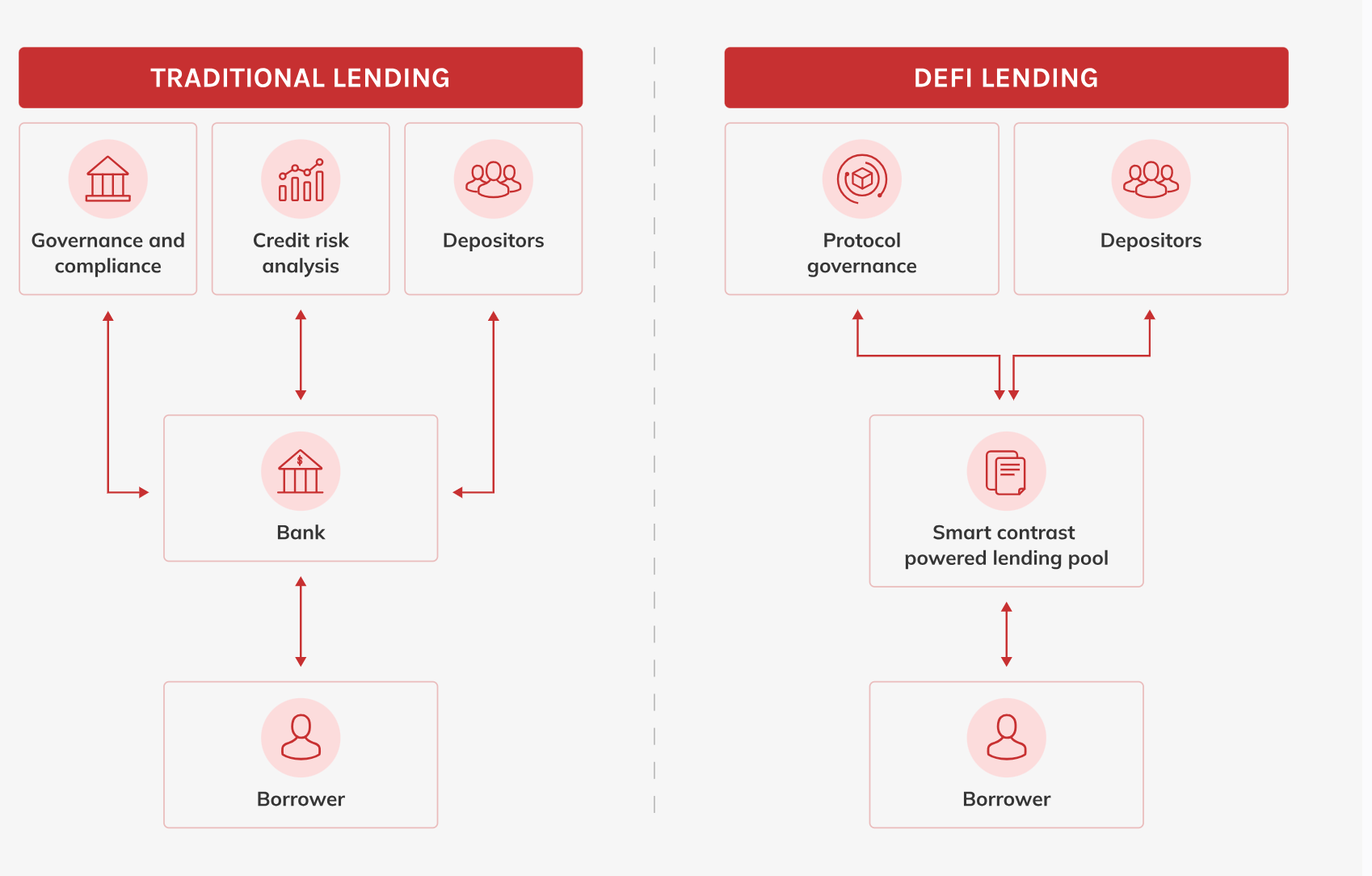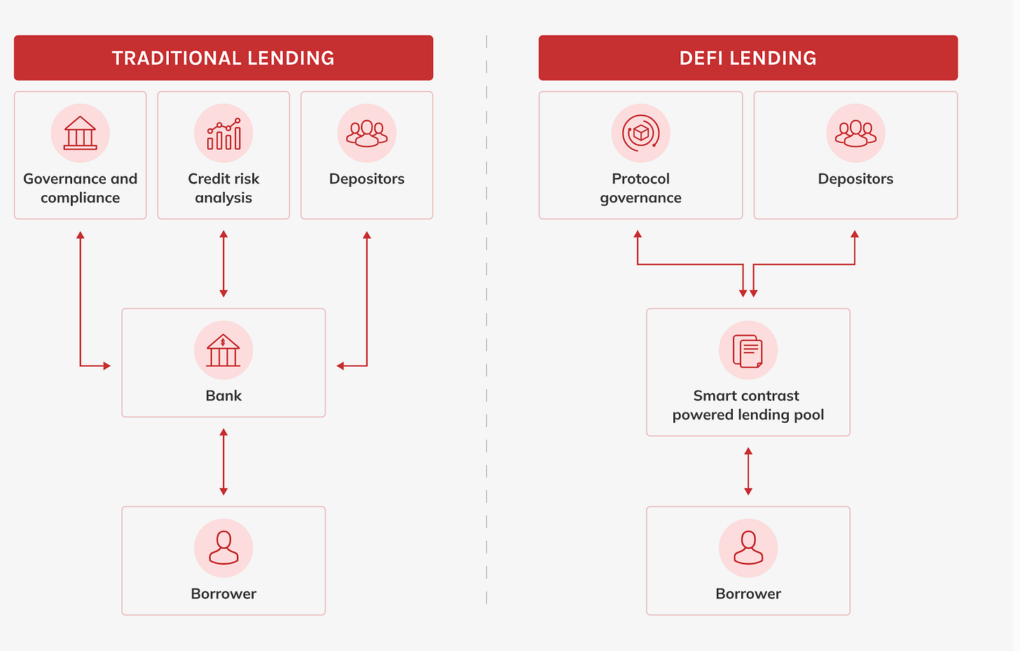 In DeFi lending and borrowing, it’s a bit different. Crypto borrowing in DeFi allows individuals to take loans in cryptocurrency or stablecoins using their digital assets as collateral. Unlike traditional finance, DeFi operates on decentralized platforms built on blockchain technology, eliminating the need for intermediaries such as banks in facilitating loans. Smart contracts automate the borrowing and lending processes, ensuring transparency and security for all parties involved. Creditworthiness is checked in DeFi lending as they mainly rely on collateral, meaning anyone can borrow funds as long as they provide sufficient collateral, regardless of their traditional credit history.