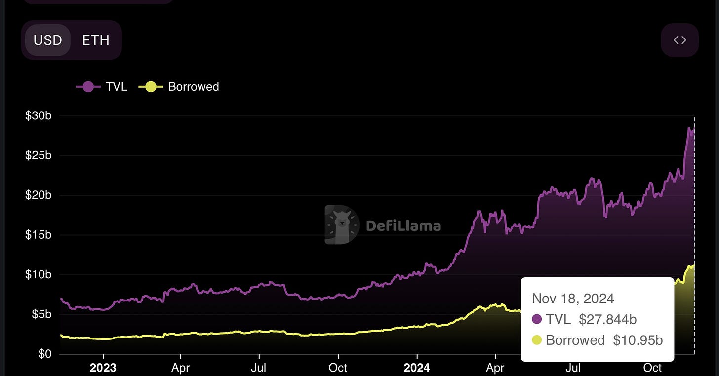 As of the time of writing, the total amount borrowed in DeFi as shown on the charts is significantly low compared to traditional finance. This is due to the high collateral requirements of most DeFi lending protocols and the volatility in crypto assets, which can increase interest rates.