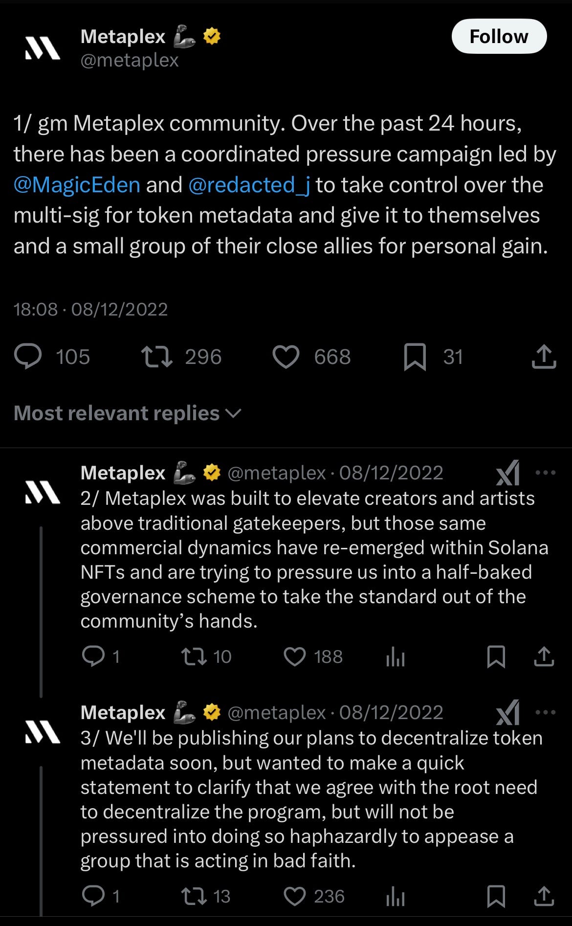 The metaplex team has the best interest of the community at heart and would do the absolute best to make sure creatives not just devs are protected and they get their flowers. This is reflected in how they handle the pressure from institutions wanting to gatekeep the token metadata, as shown in the tweet below.